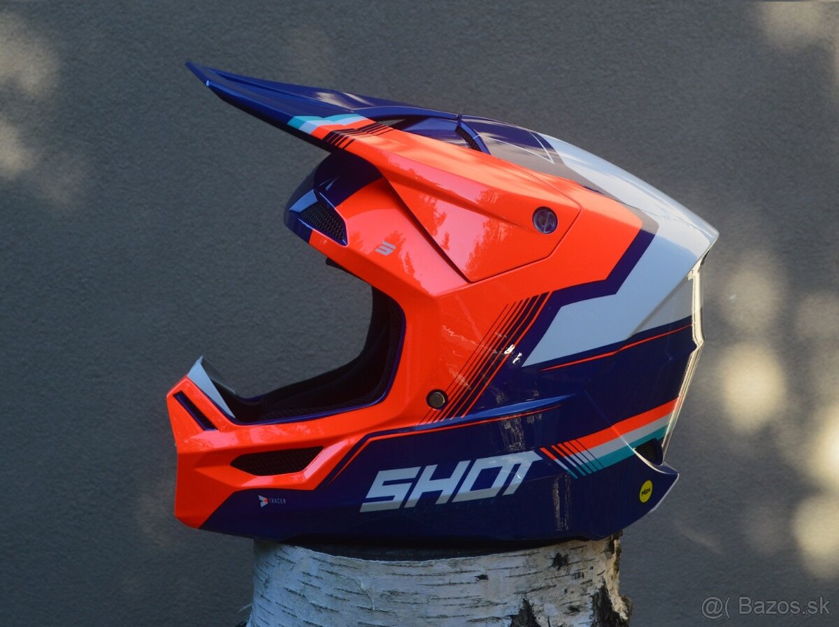 Predám prilba helma shot pre motocross enduro štvorkolka pitbike. Veľkosť L 59-60cm, 149e, Nová. Okuliare 33e,zabalená. Platné do zmazania.