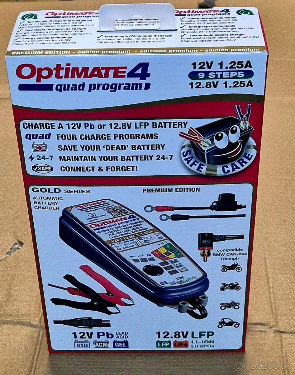 Predam novú original zabalenú profi nabíjacku zn.Optimate 4 Quaid -Premium. Nabijanie vsetkych typov batérii- bezudrzbove, olovené, gélové, Super MF, VRLA, Lithium( LiFePo4). Oživovanie hlboko vybitých batéri , 4 nabíjacie programy, systém nabijania aj cez Can-bus ( BMW, Triumph, Ducati ) , režim Lithium ( LifePo4) , desulfatacia, Led signalizácia, udržiavací režim, ochrana proti prepólovaniu , trvalé pripojenie k akumulátoru.