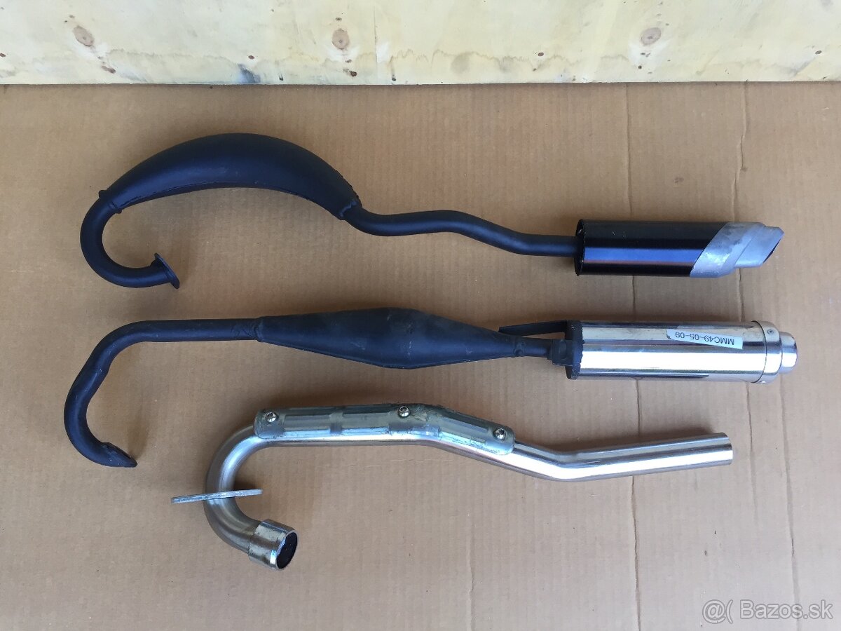 Nové výfuky za 20€, a riadítka na moto, od 10€ (modré), ostatné s výstužou za 15 a 20€, nový bočný stojan za 10€.