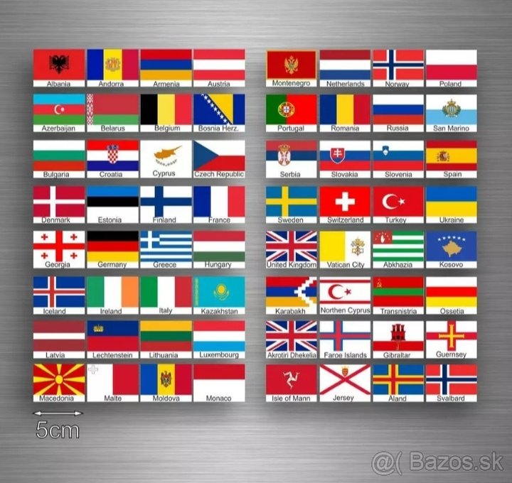 Predám sadu 64 ks kvalitnych nálepiek vlajok europy.vhodne na motorku alebo auto.rozmery 5cm x 3,7cm (s nazvom statu) alebo rozmer 5cm x 3cm (bez nazvu statu) pripadne sada mensich nálepiek s rozmermi 15mm x 11mm. vid foto