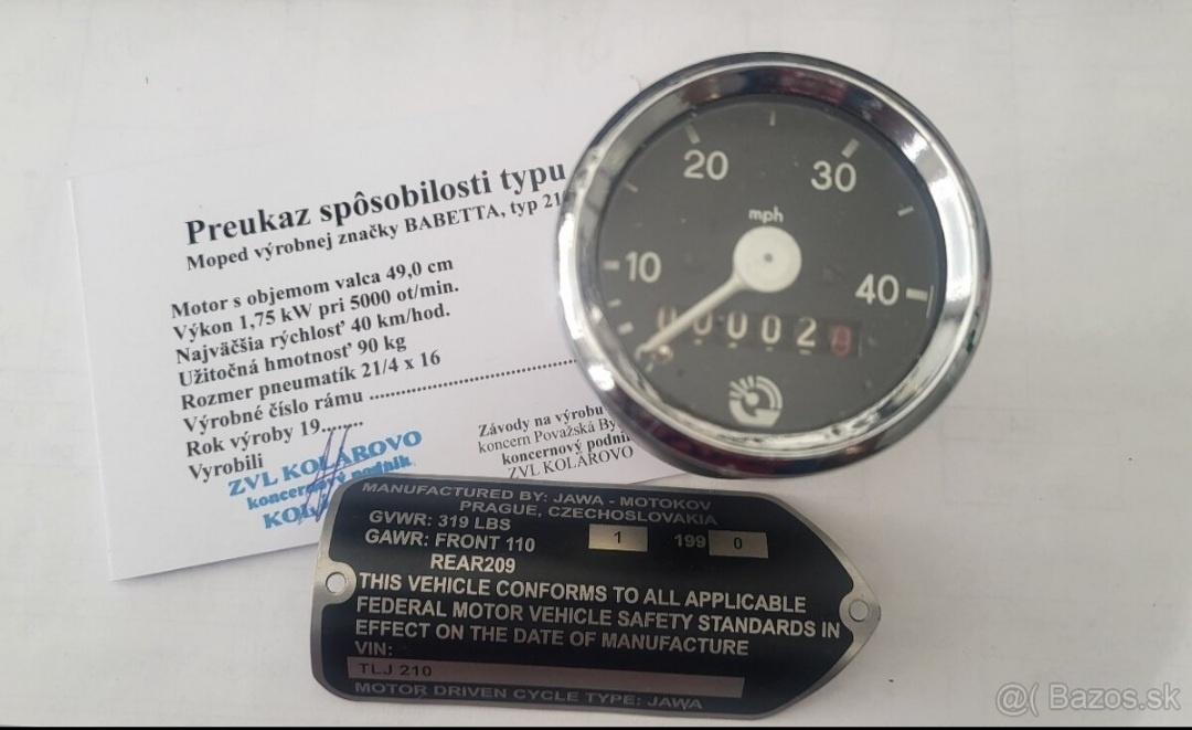 Predám / vymenim nový nepoužitý tachometer v milach , štitok v angličtine a preukaz spôsobilosti určený na BABETA typ 210 = všetko originál (žiadna 5 eurová doma vytlačená kópia )