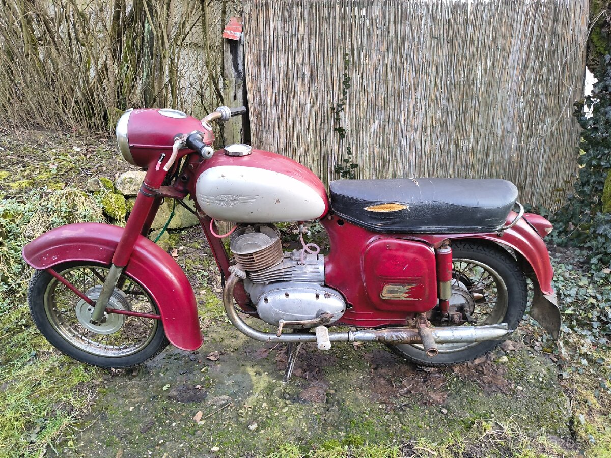 Je plne pojazdná a funkčná vo veľmi peknom stave, motor pracuje potichu…Štartuje na kopnutie, svietí, brzdí, trúbí všetko funguje na tom ako má.