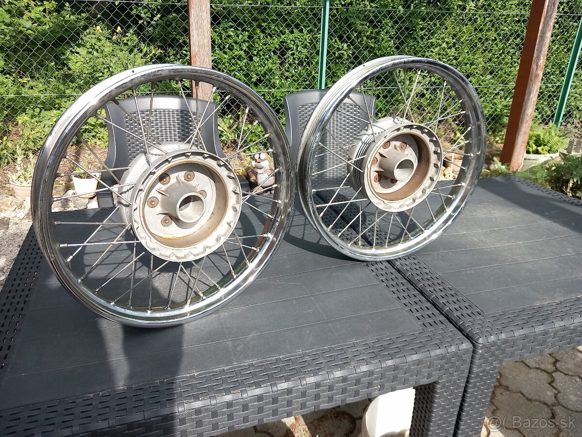 Vymením tieto dve nové nikdy nepoužité predné kolesá na prvé malé kývačky do roku 1958. Sú to uloženky zo starých zásob ČSSR nie repliky. Ešte v nich neboli osadené ani ložiská. Obidve kolesá sú rovnaké s unášačom rozety a šírkou ráfiku 58 mm (1,60). Kolesá sú nečistené, ešte zakonzervované od výroby. Vymením za takisto uloženkové nepoužité kolesá ale na mladšie Čz 175/450 a to predné s rovnakou šírkou ráfika 58 mm ale bez unášača rozety a zadné s unášačom a šírkou ráfika 68 mm. (1,85) takisto zachovalé s nepoškodeným pekným chrómom ako na mojich. Ak máte na výmenu tak môžme vymeniť alebo môžte odpredať pokiaľ nemáte záujem o moje. Môžme vymeniť aj po kuse ak máte len jedno koleso na výmenu. Zrenovované replikové mi neponúkajte. Ďakujem. Kontaktujte ma na mail, alebo tel:0902292125.