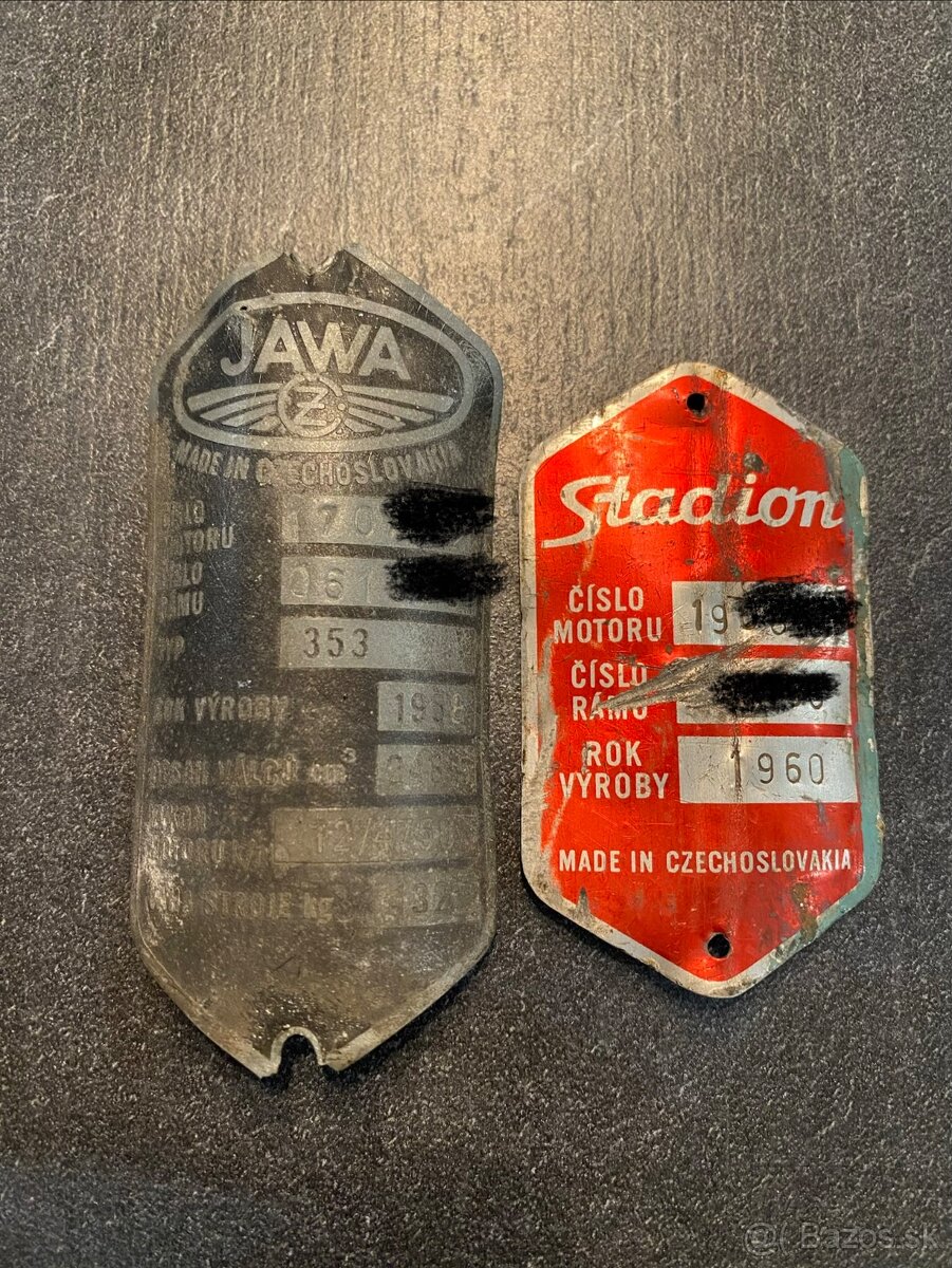 Ponúkam na predaj originál výrobné štítky na Jawa 250 353 1958 a Stadion 1960. Nie su v databaze. Cena spolu 30€