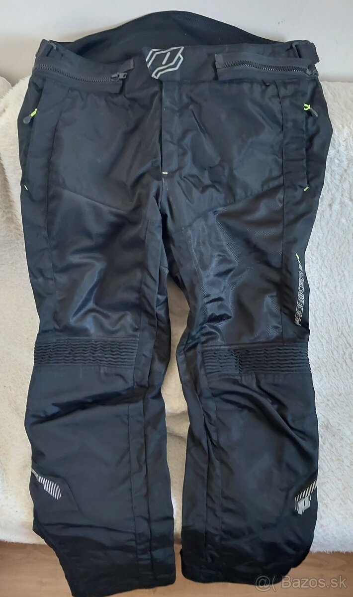 na predaj textilne motonohavice zn. Probiker,velkost udavana 60,celkova bocna dlzka nohavic od spojovacieho zipsu 110cm,pas (vyvyseny)do cca 105cm+stahovanie,boky cca 125cm.nohavice maju chranice kolien Sas-tec,pripravu na bedrove chranice,moznost vzipsovat tepelnu vlozku(nie je v ponyke),maju vodeodolnu,paropriepustnu upravu,priedusne meshove panely na prednej a zadnej casti stehien.