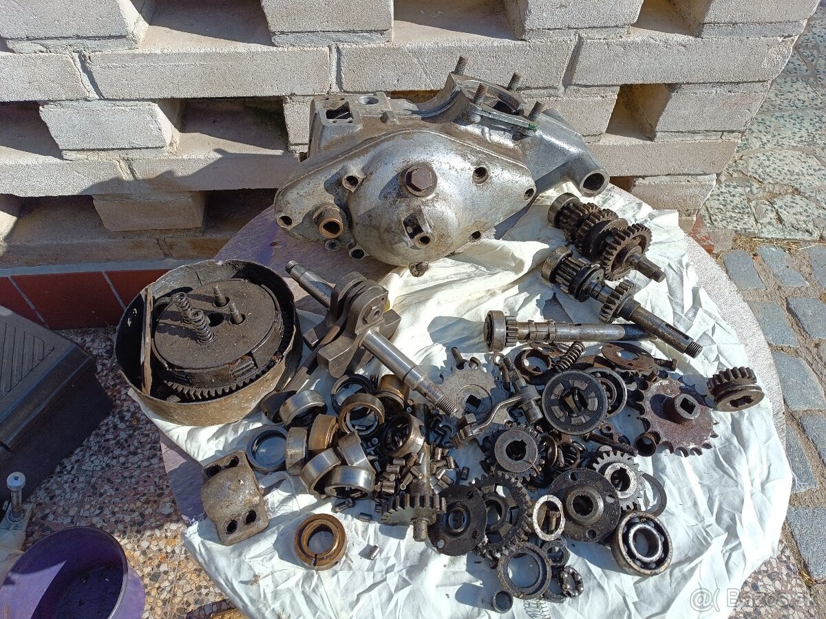 Prodám na předválečný motocykl ČZ 175 jednovýfuk rozebraný motor. Dle výrobního čísla motoru 7666, se jedná o jeden z prvních motorů této malé vzácné jednovýfukové série. Motor je rozebraný, kompletnost viz foto (chybí válec,hlava a další drobnosti, něco zase navíc). Karty jsou párové, zespodu trochu vařené, viz poslední foto. Po vybroušení bude ok, je to jenom povrchové uvnitř to vařené není. Cena za vše 7000,-Kč.