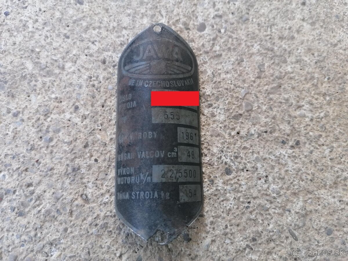 Predám originál pôvodný štítok na Jawu 555. Rok výroby 1961. Originál pôvodný v slovenčine. Vin číslo neposkytujem, uvidí ho len kupujúci, je samozrejme originálne a pekne čitateľné. Cena 39€.